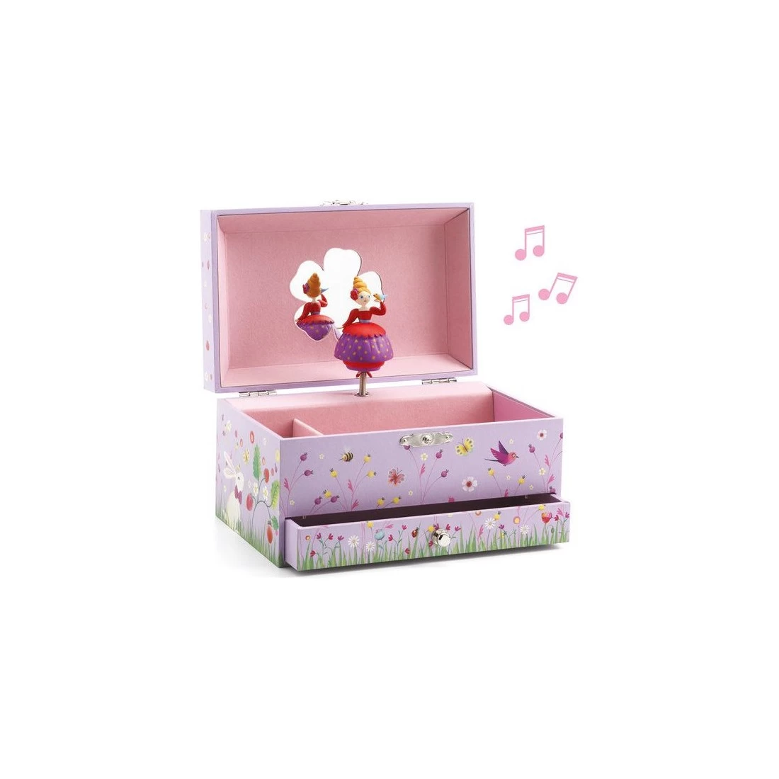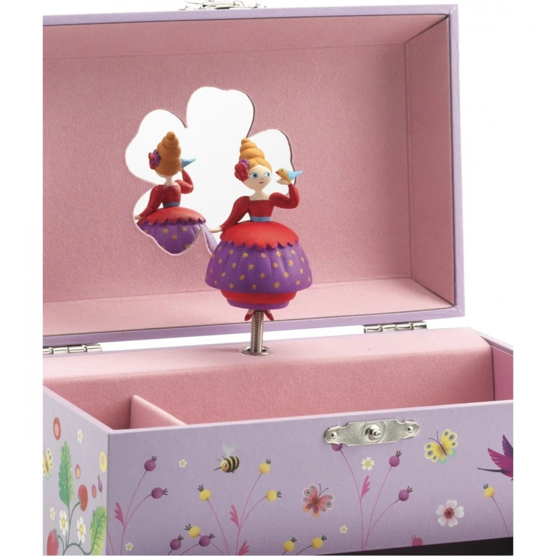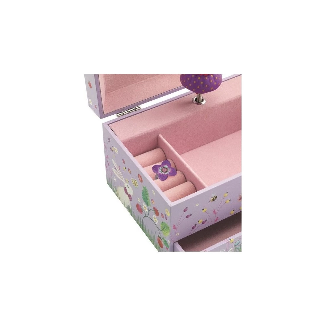 Dans la chambre des petites filles, cette jolie boîte à musique trouvera sa place ! L’intérieur de la boîte à musique est rose pale, en tapis. De l’extérieur, elle est mauve avec de nombreuses fleurs, des lapins, des oiseaux et des insectes. Les couleurs sont douces et tendres et laissent penser au printemps.