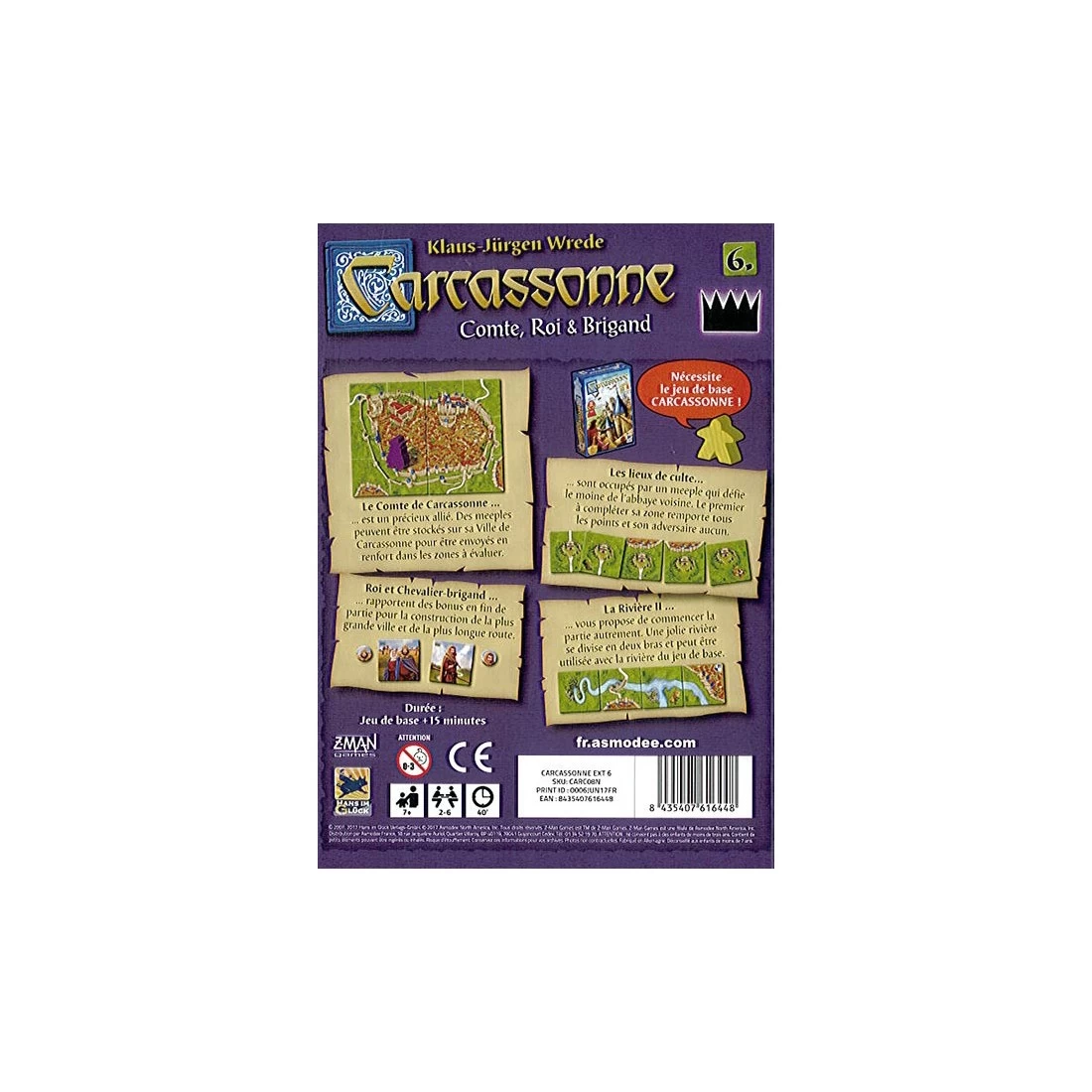 Carcassonne – Comte, roi et brigand regroupe quatre mini-extensions. Le comte introduit dans le jeu le concept d’entraide… mais pour un temps limité ! La rivière n°2 renouvelle pour sa part le début de partie. Roi et brigands accordent des récompenses pour la plus grande ville et le plus long chemin.