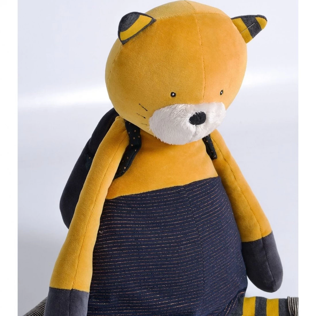 La Lulu « » est un grand chat de 59 cm de hauteur, un grand et des aventures avec bébé. Lulu le chat porte une salopette à rayures cuivrées et des chaussettes rayés, qui mettent en valeur son beau pelage couleur moutarde. Sur son dos il a un sac à dos, qu’il pretera avec plaisir à bébé pour qu’il puisse y ranger son pyjama, ses petits jouets ou des trésors.