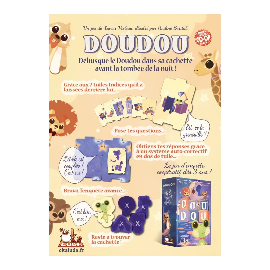 Doudou est un coopératif dans lequel les petits détectives devront collaborer pour débusquer le doudou dans sa cachette, avant la tombée de la nuit !