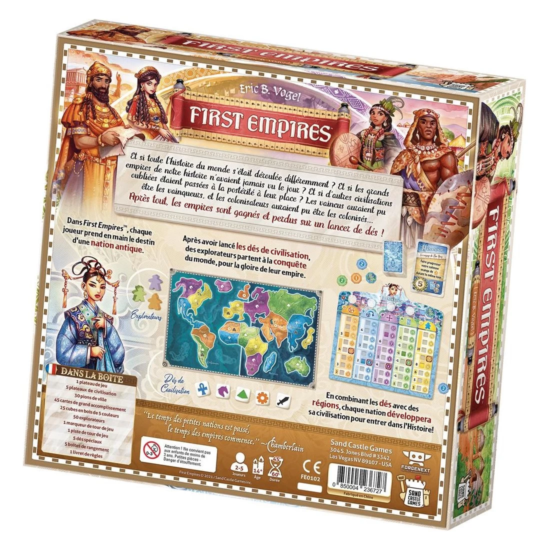 Dans First Empires, chaque joueur prend en main le destin d’une nation antique. Après avoir lancé les dés de civilisation, des explorateurs partent à la conquête du monde, pour la gloire de leur empire. En combinant les dés avec des régions, chaque nation développera sa civilisation pour entrer dans l’Histoire !