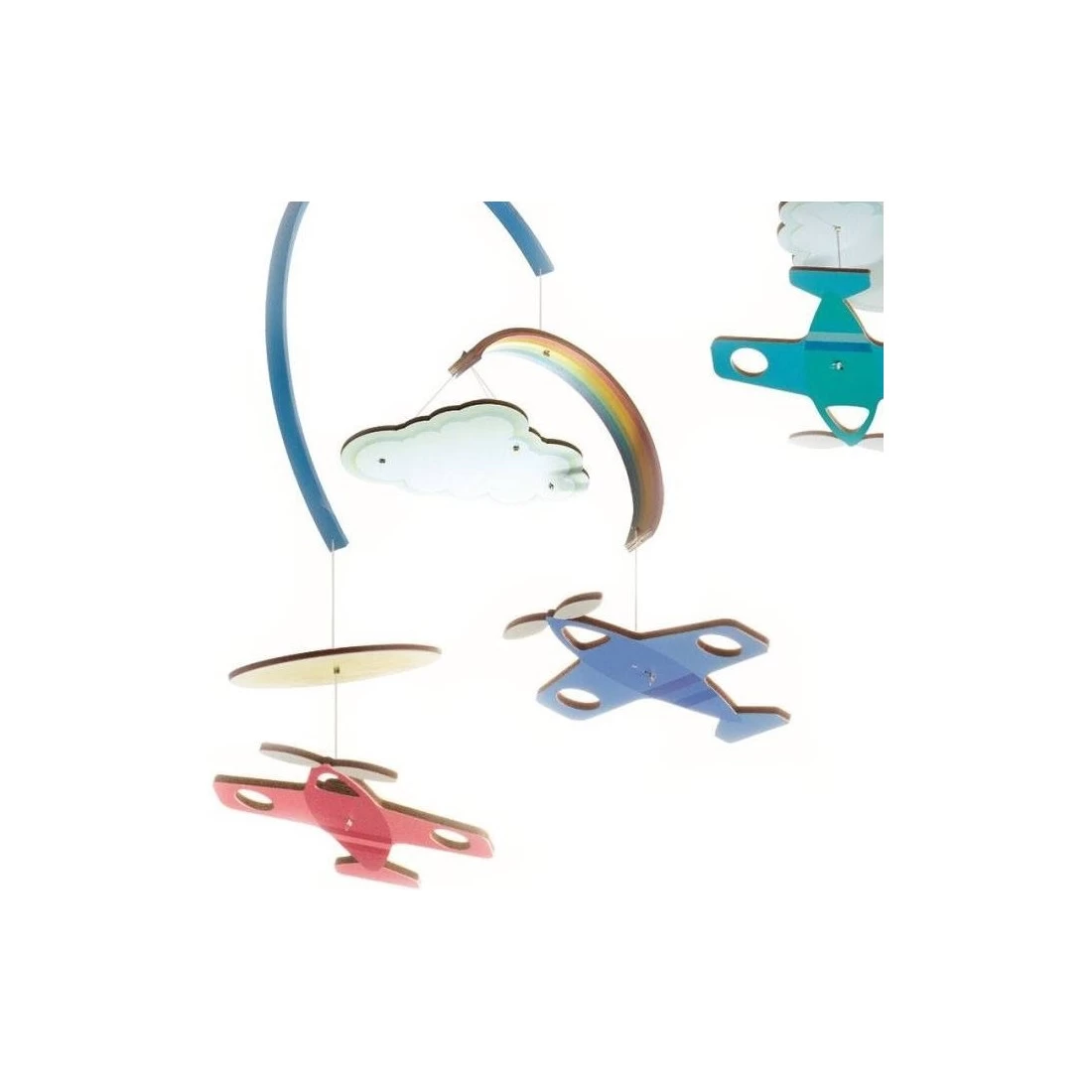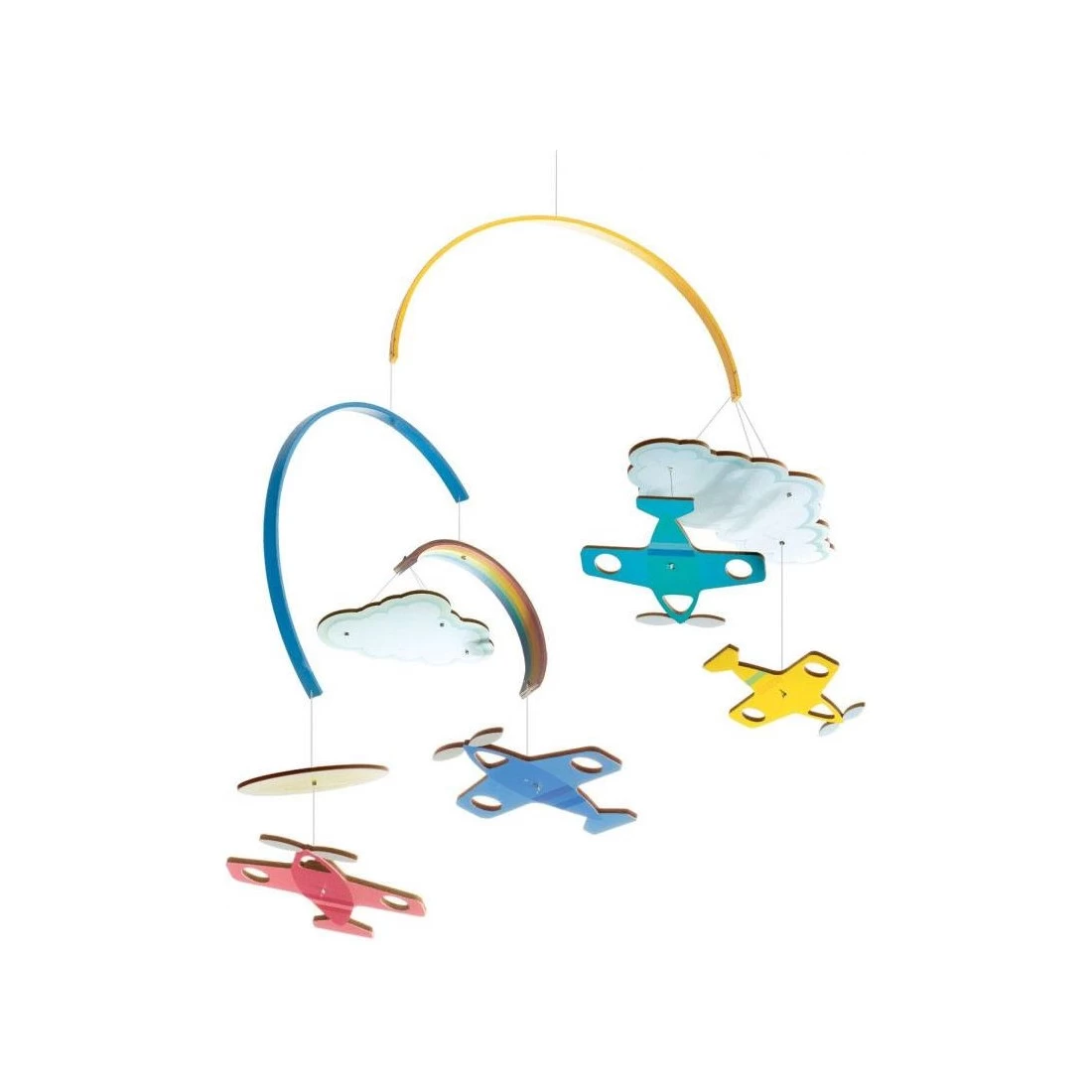 avions de Djeco, un mobile en bois avec des avions colorés qui volent parmi les nuages et les arc-ciel.