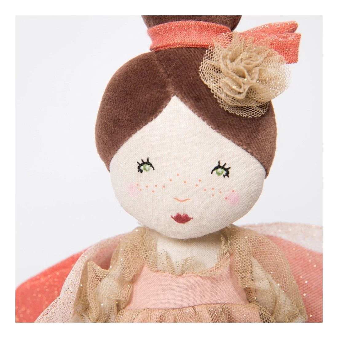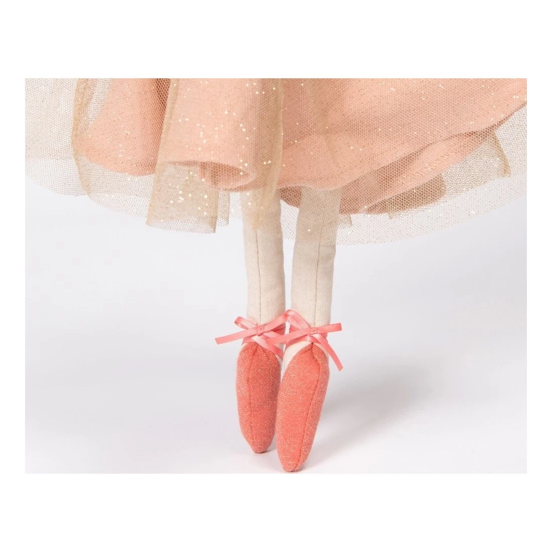 La de la collection de est une jolie poupée en tissu chambray. Son mignon visage brodé et sérigraphié plaira à votre petite fille. La poupée fée est habillée avec une robe en coton et un voile de tulle pailleté. De couleur ros poudré, la poupée possède des ailes de fée et de jolis chaussons de danse avec rubans en satin.