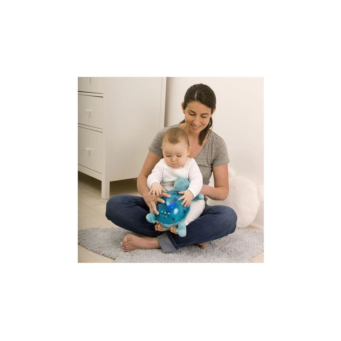La veilleuse est toute douce et possède une carapace en plastique solide. Elle peut se placer au centre de la pièce ou proche de bébé pour le rassurer.
