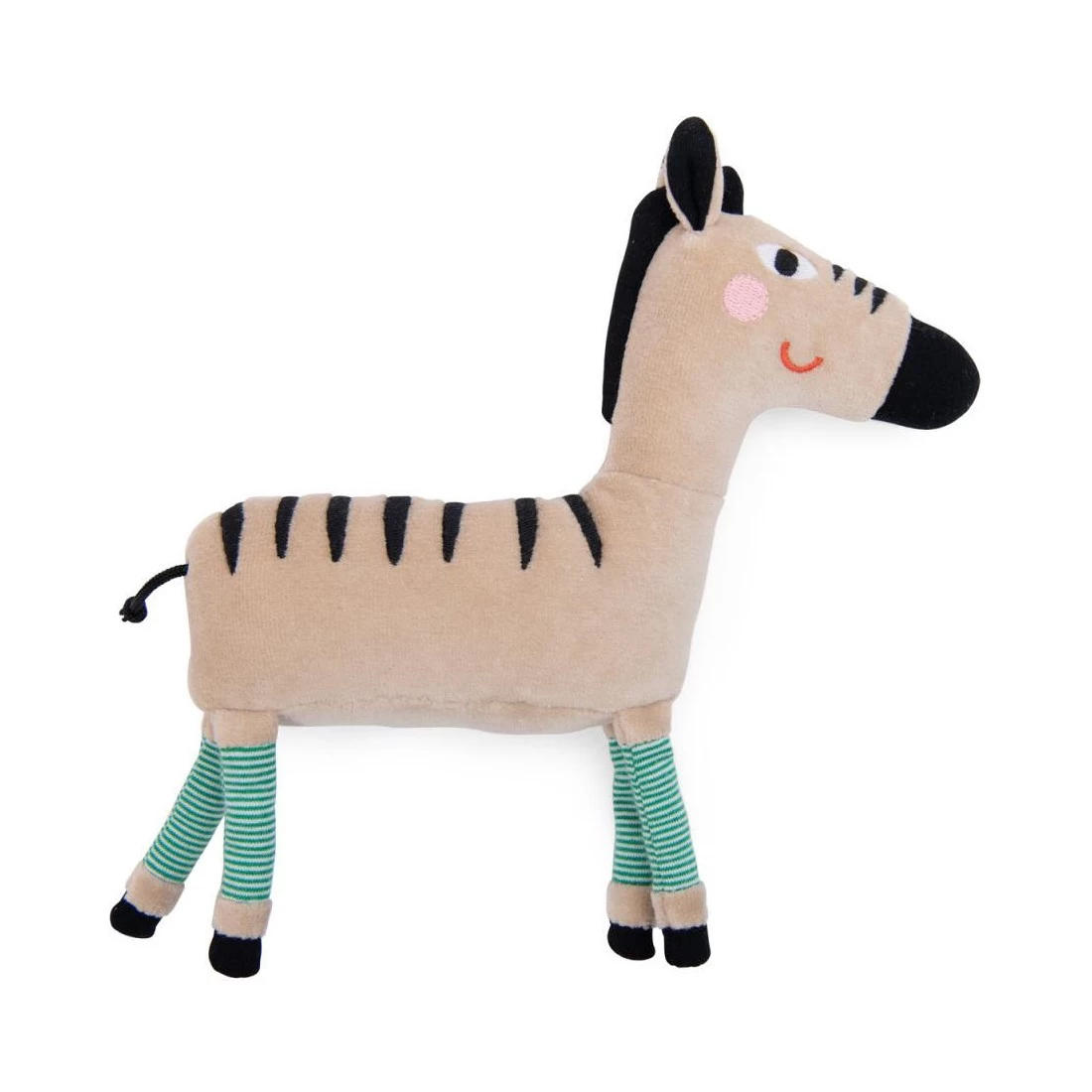 Petit zèbre en velours tout doux. Crinière coiffée et chaussettes rayées lui donne une sacré personnalité. Tout sourire et facile à saisir, il fera craquer bébé. Dans son ventre se cachent de qui font du bruit quand on l’agite.